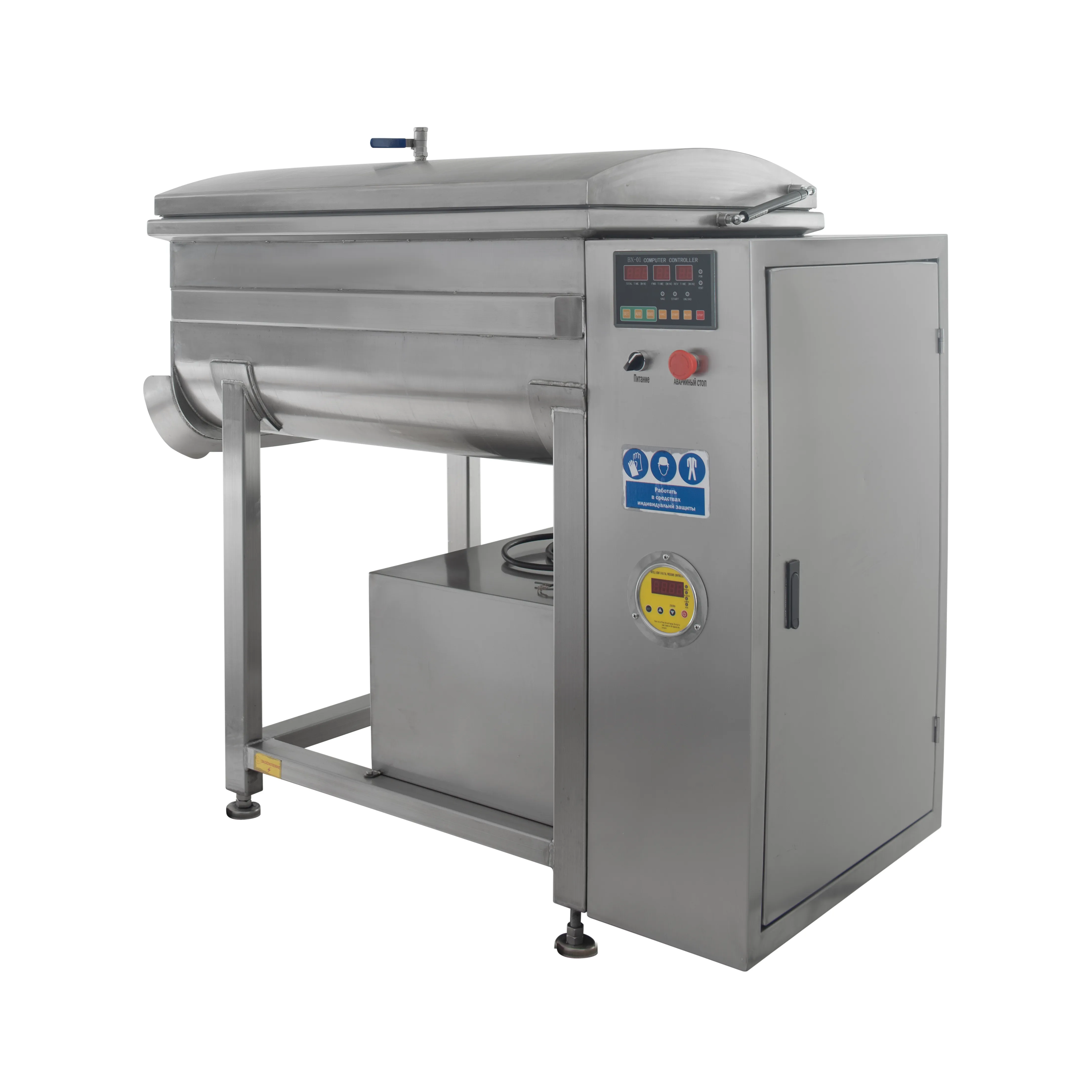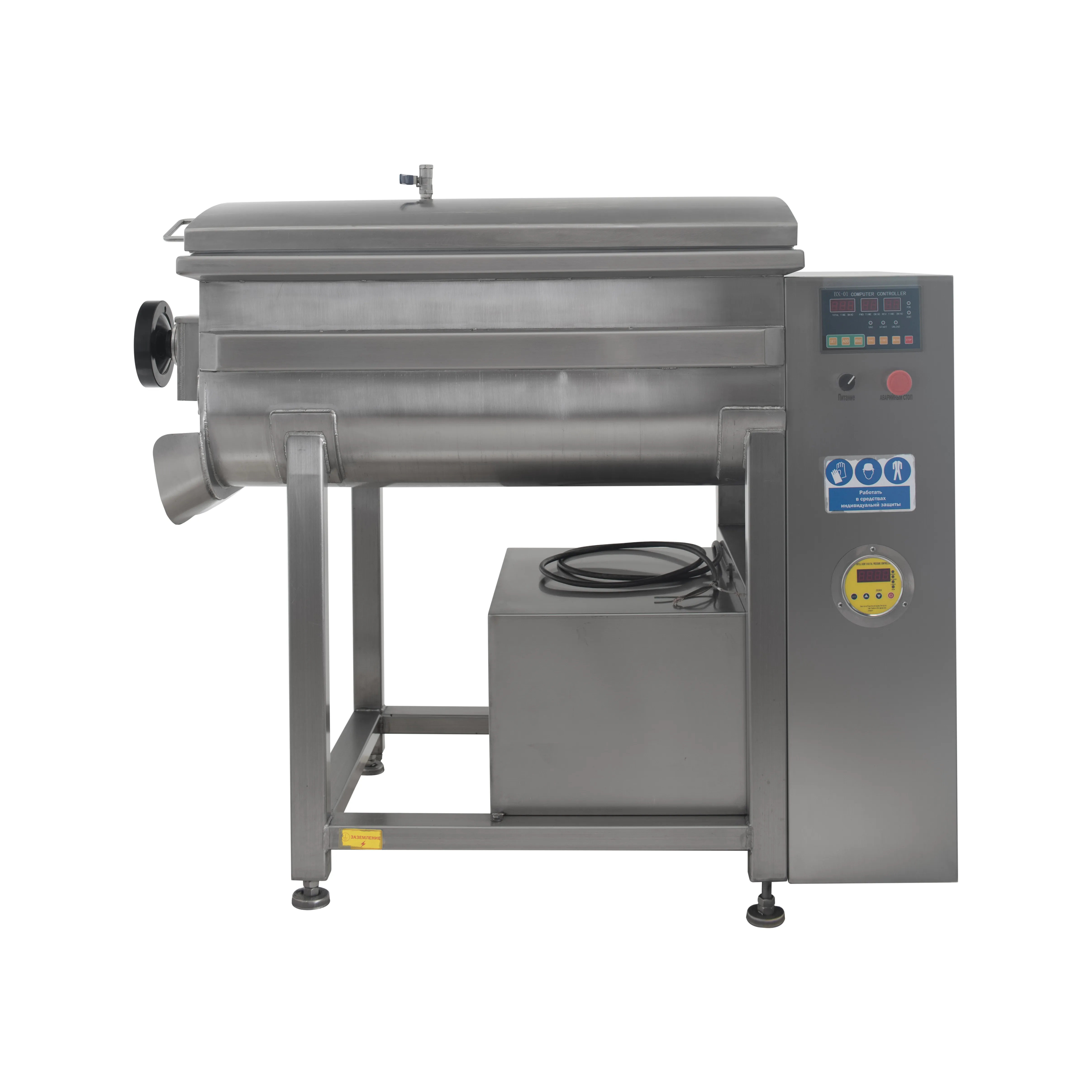 Система позволяет добиться равномерного перемешивания в течение 20 минут. При этом время вакуумации составляет 2 минуты. Оборудование с ручным типом загрузки и без функции подъема опрокидывания дежи не вызывает сложностей при использовании. Ручная разгрузка дает возможность контролировать качество перерабатываемого продукта.